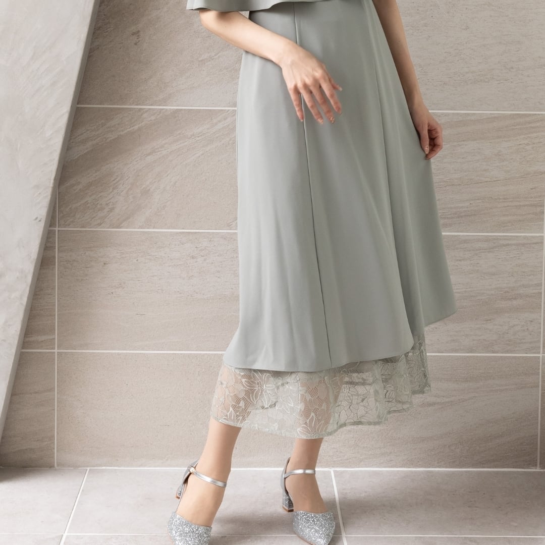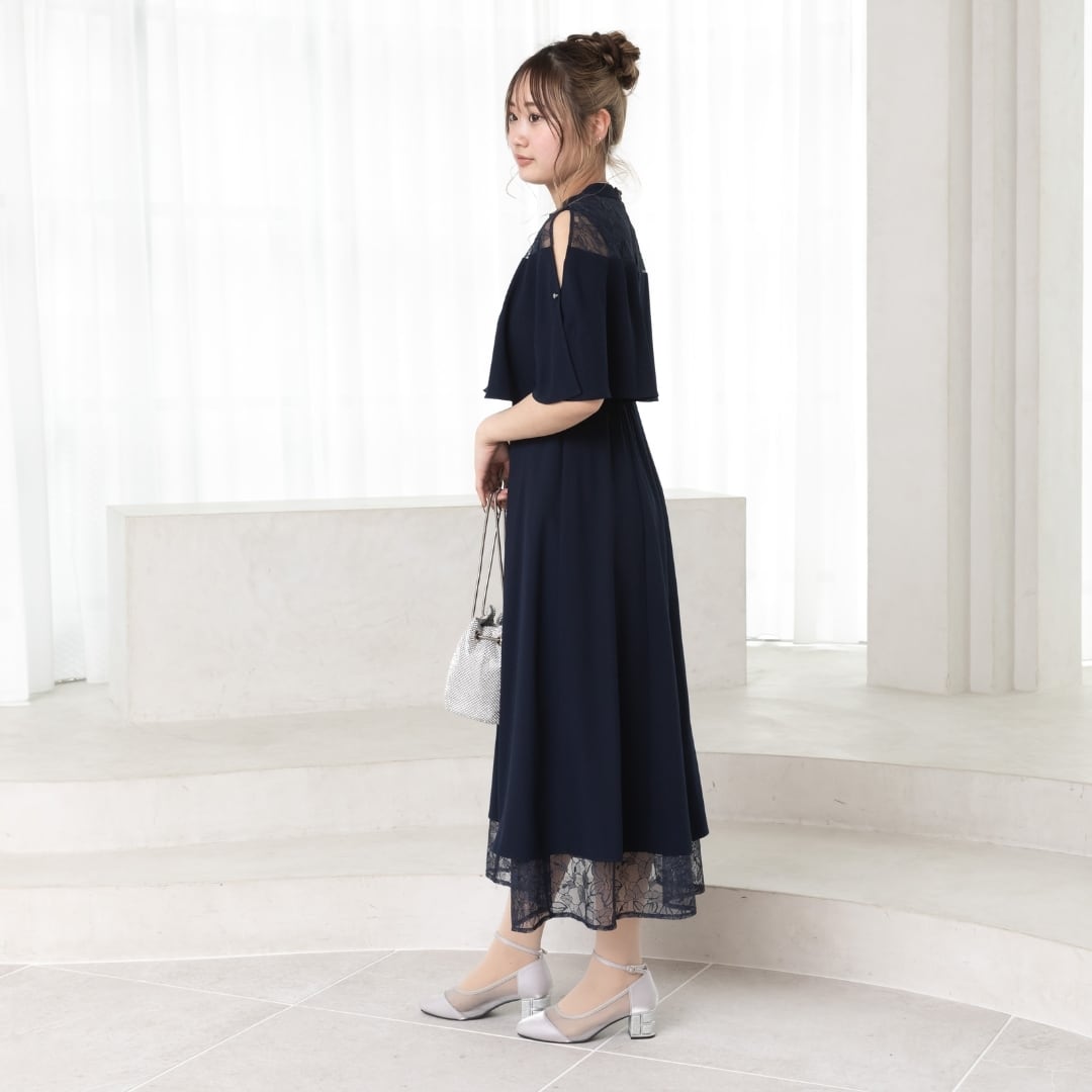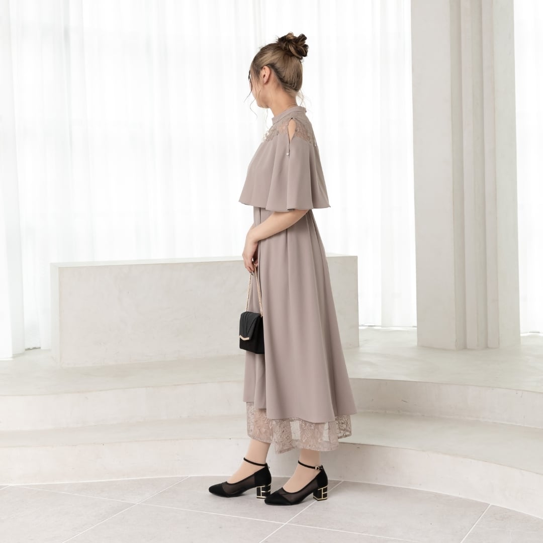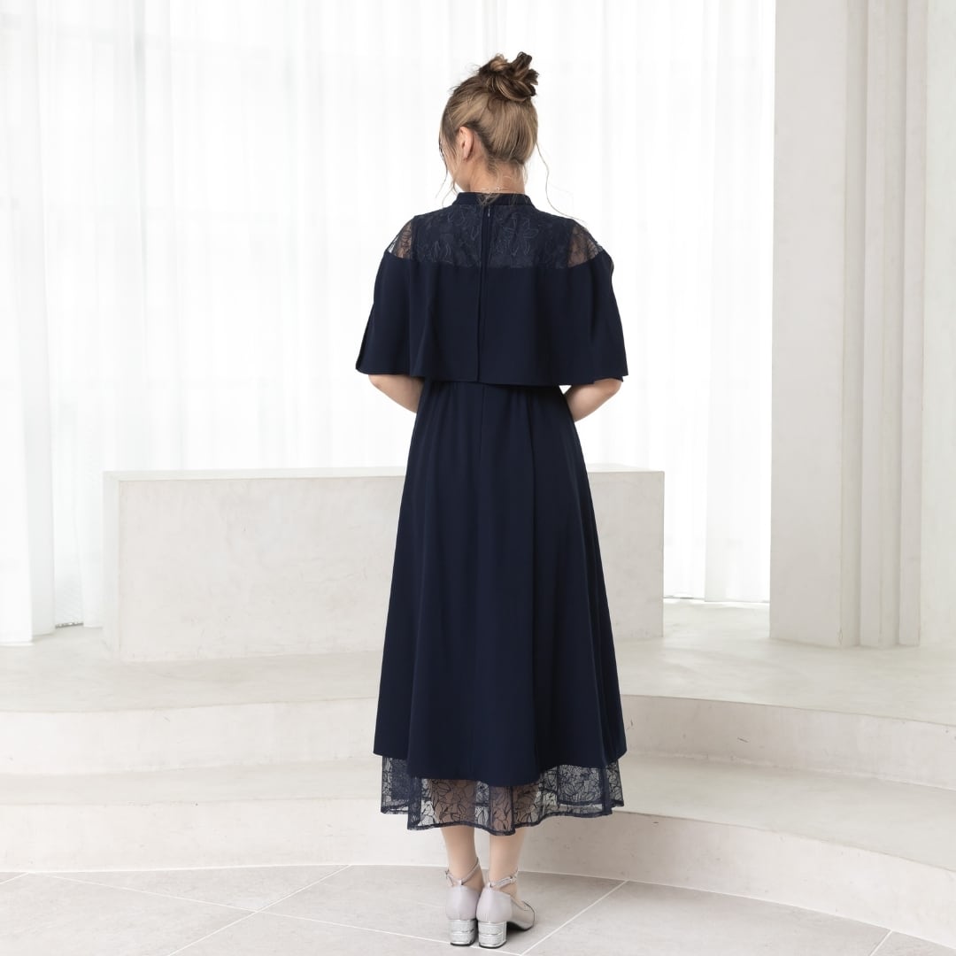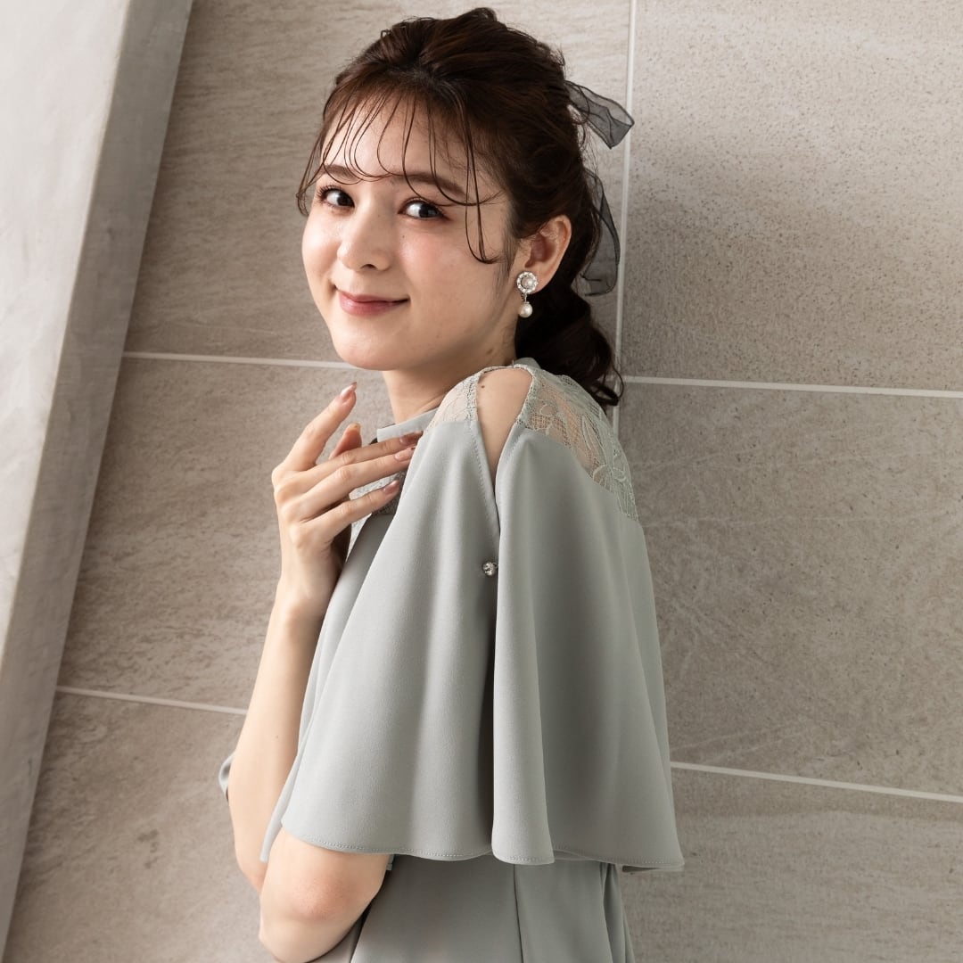 繊細なレーススカートとケープデザインがひとつになった、華やかさと着心地を両立したオケージョンドレス。