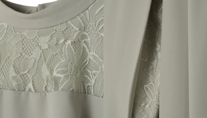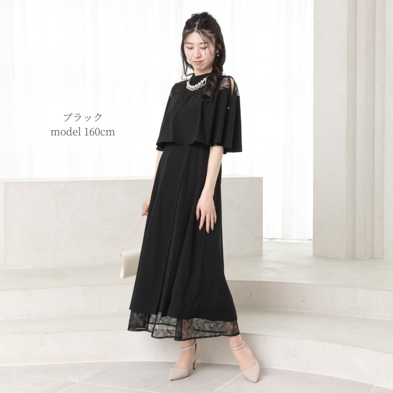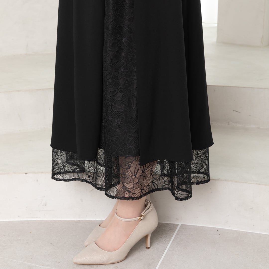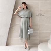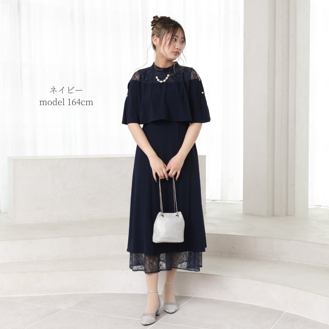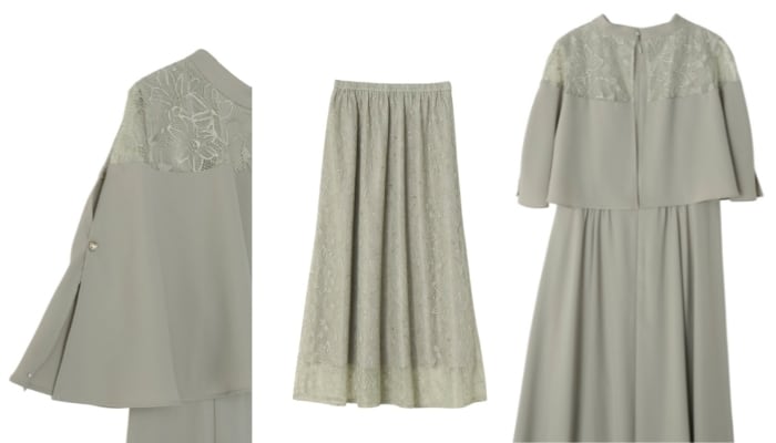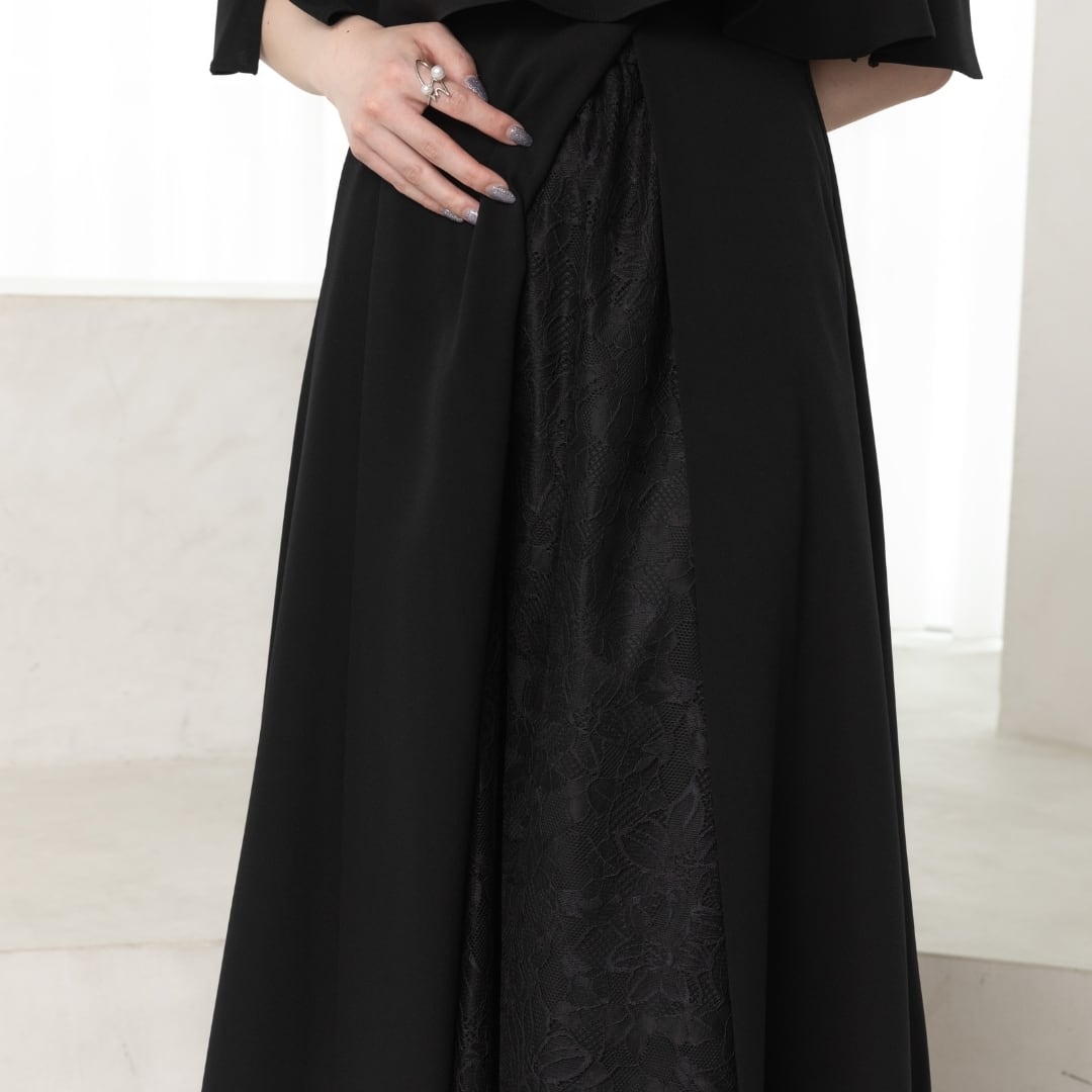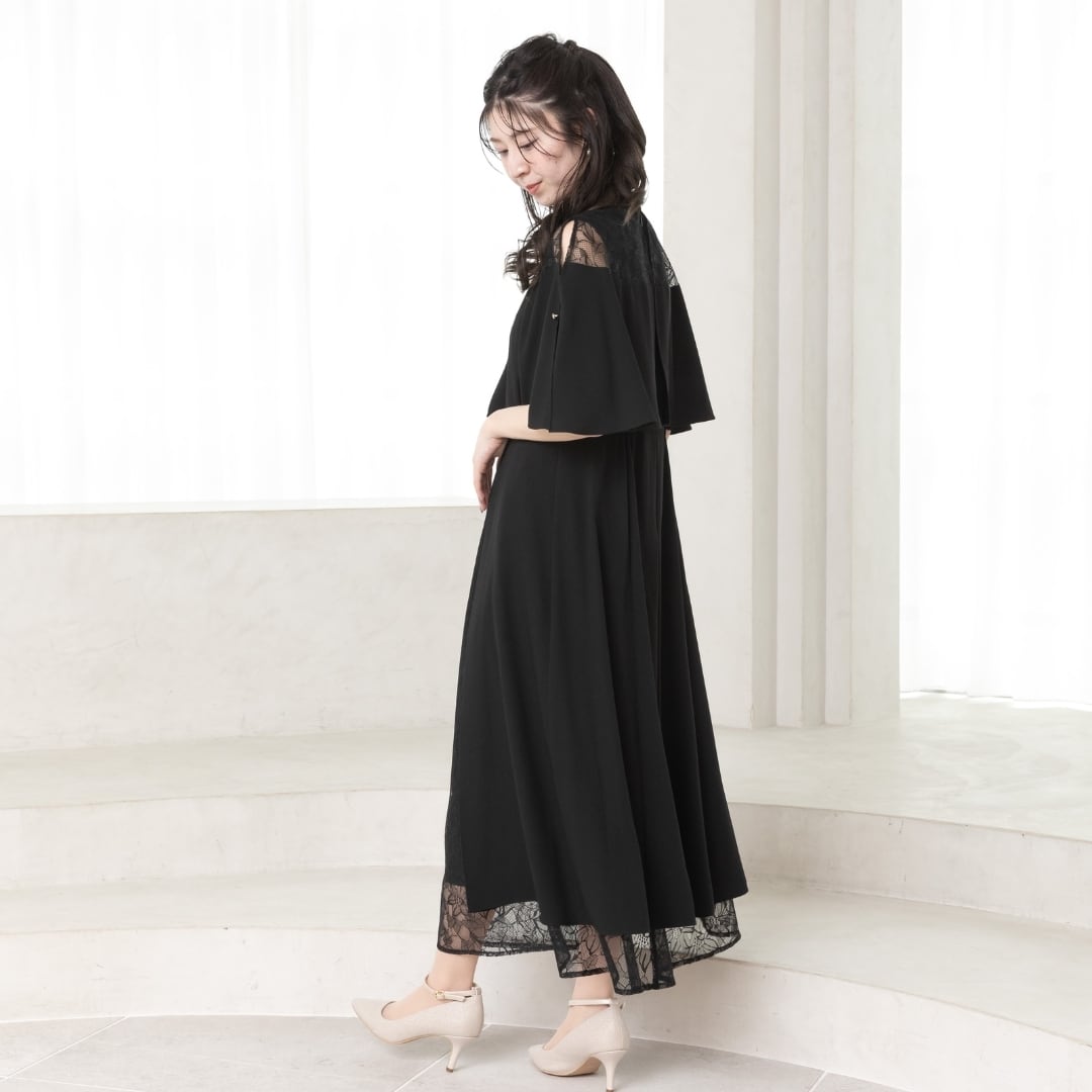 繊細なレーススカートとケープデザインがひとつになった、華やかさと着心地を両立したオケージョンドレス。