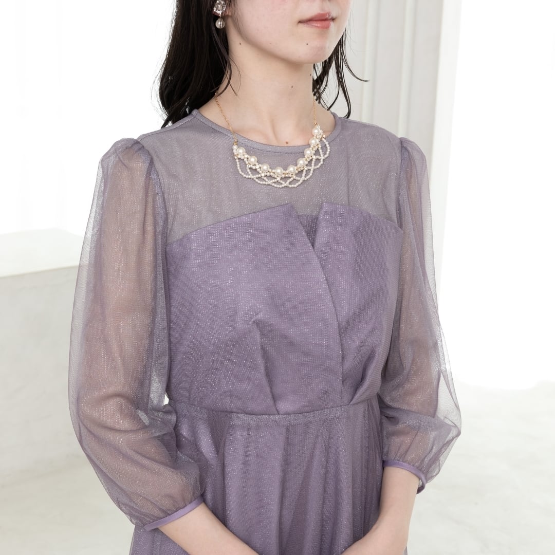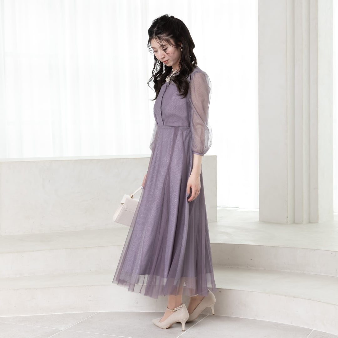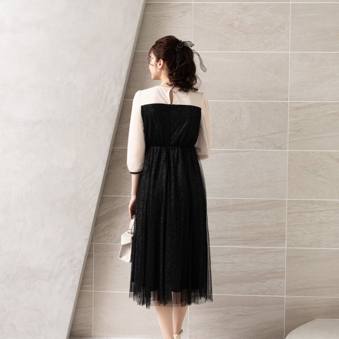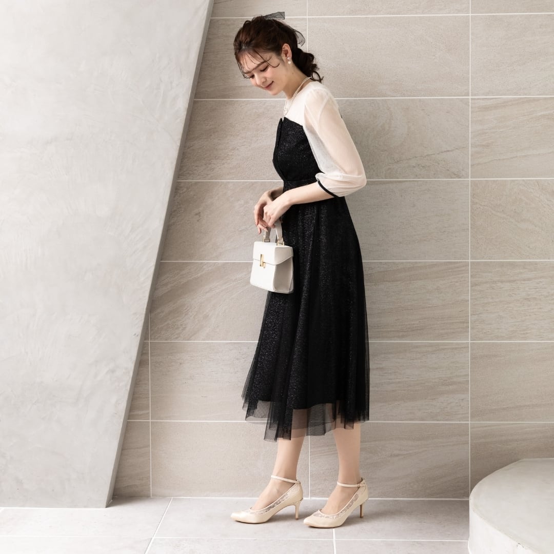 袖と足元に上品なシアー感があり、ビスチェ風のデザインがウエスト回りをすっきりと見せ、シャープなパーティースタイルに。