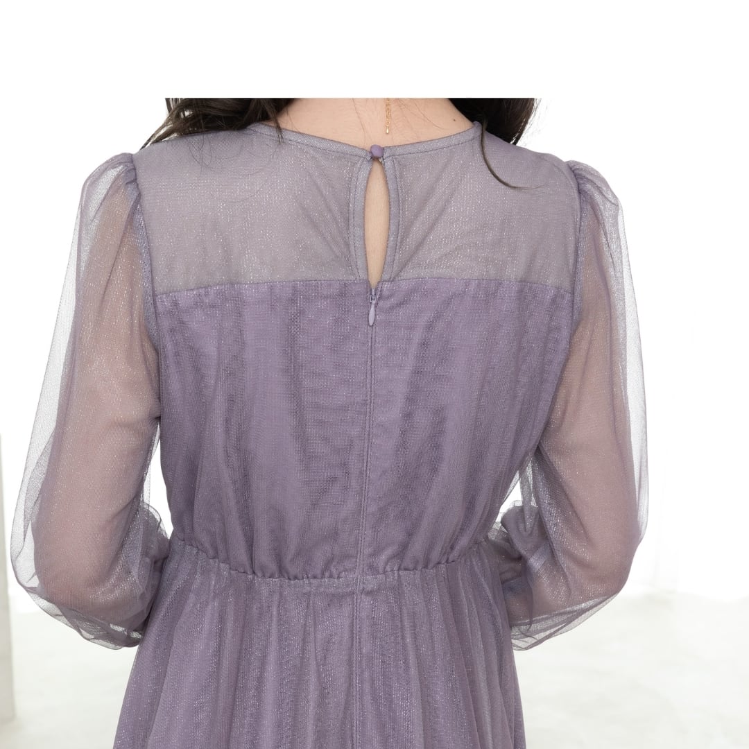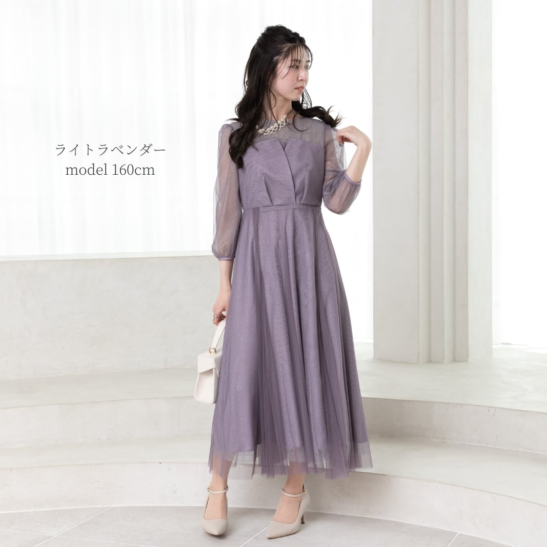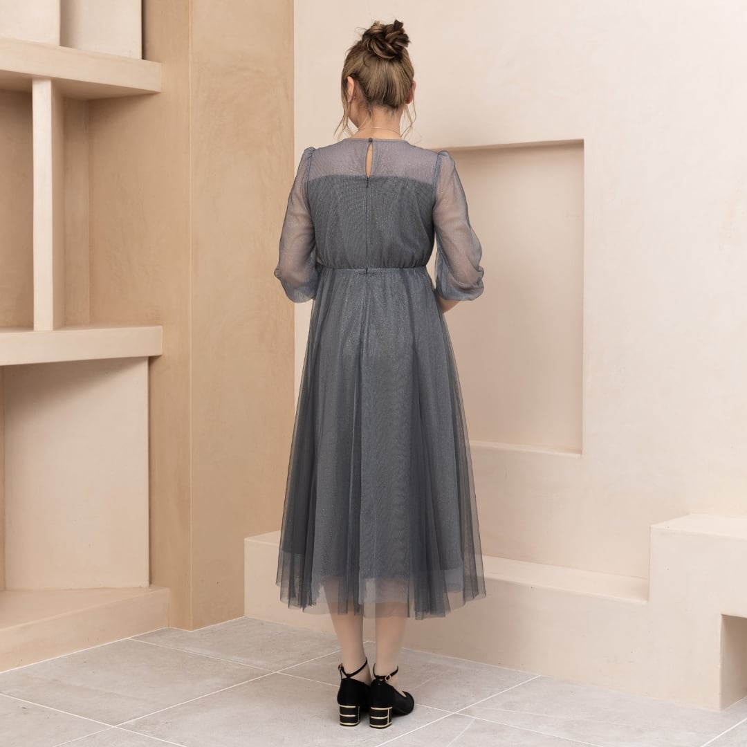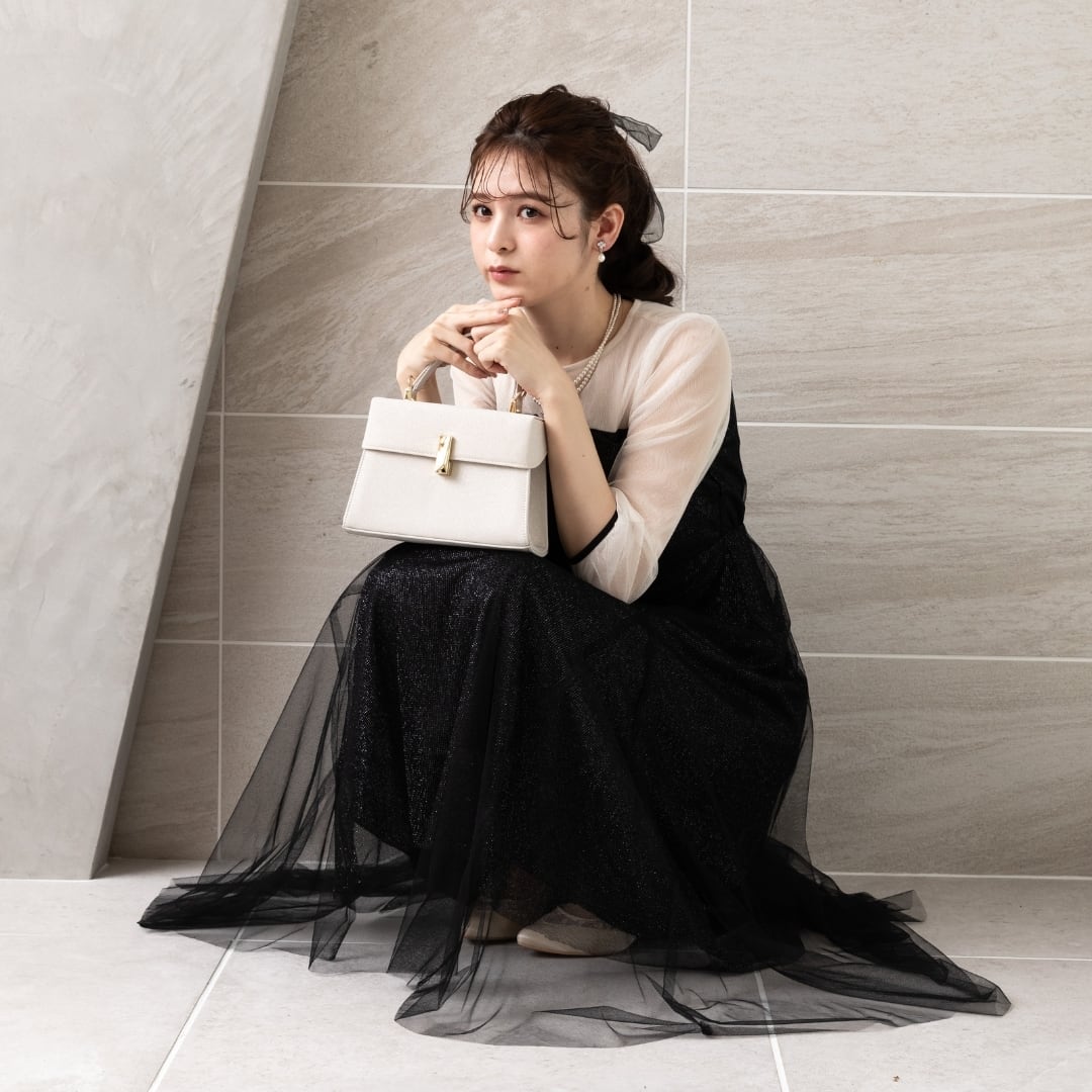 袖と足元に上品なシアー感があり、ビスチェ風のデザインがウエスト回りをすっきりと見せ、シャープなパーティースタイルに。