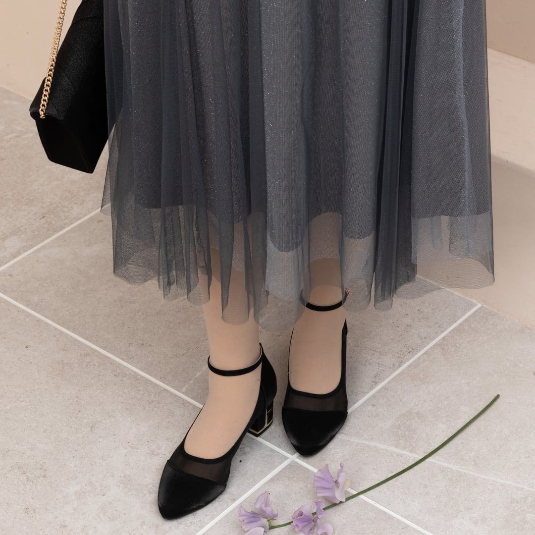 ラメチュール・無地チュール・身生地の3枚仕立てで、歩くとふわっとした広がりのあるスカート。