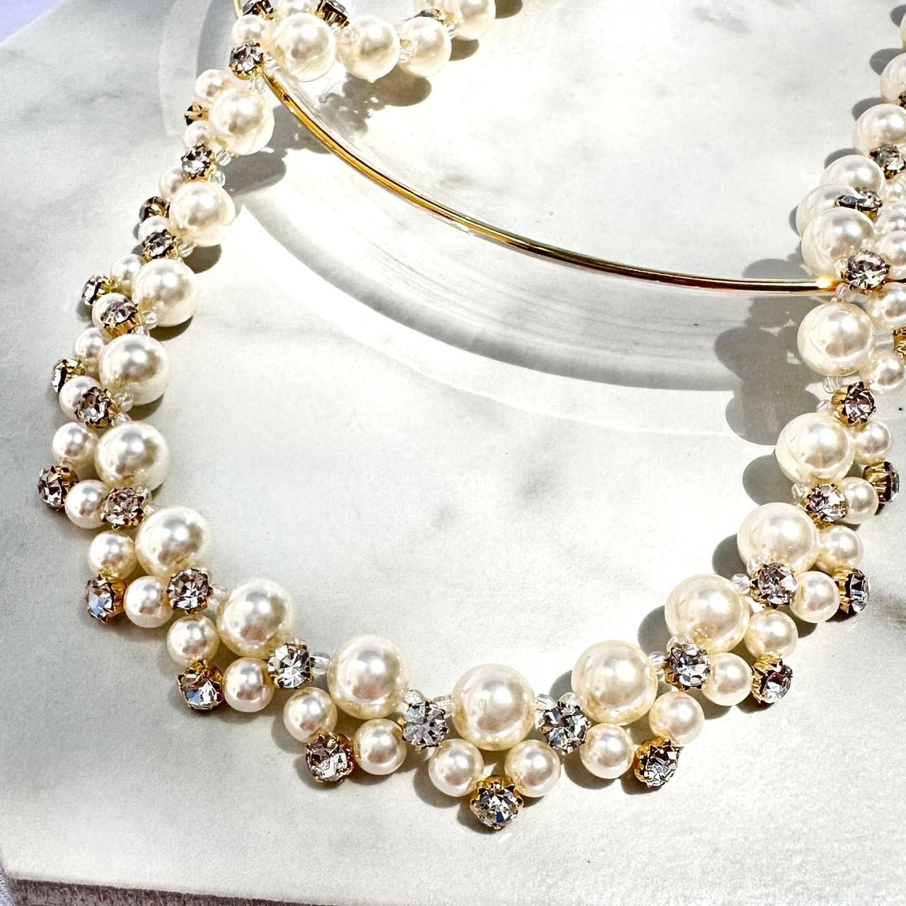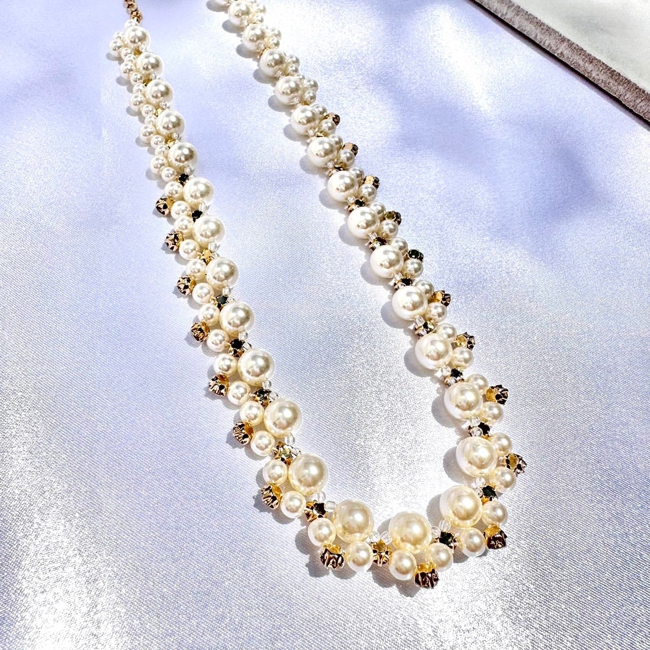 上品なパールとキラキラのラインストーンで組み合わされたネックレスは