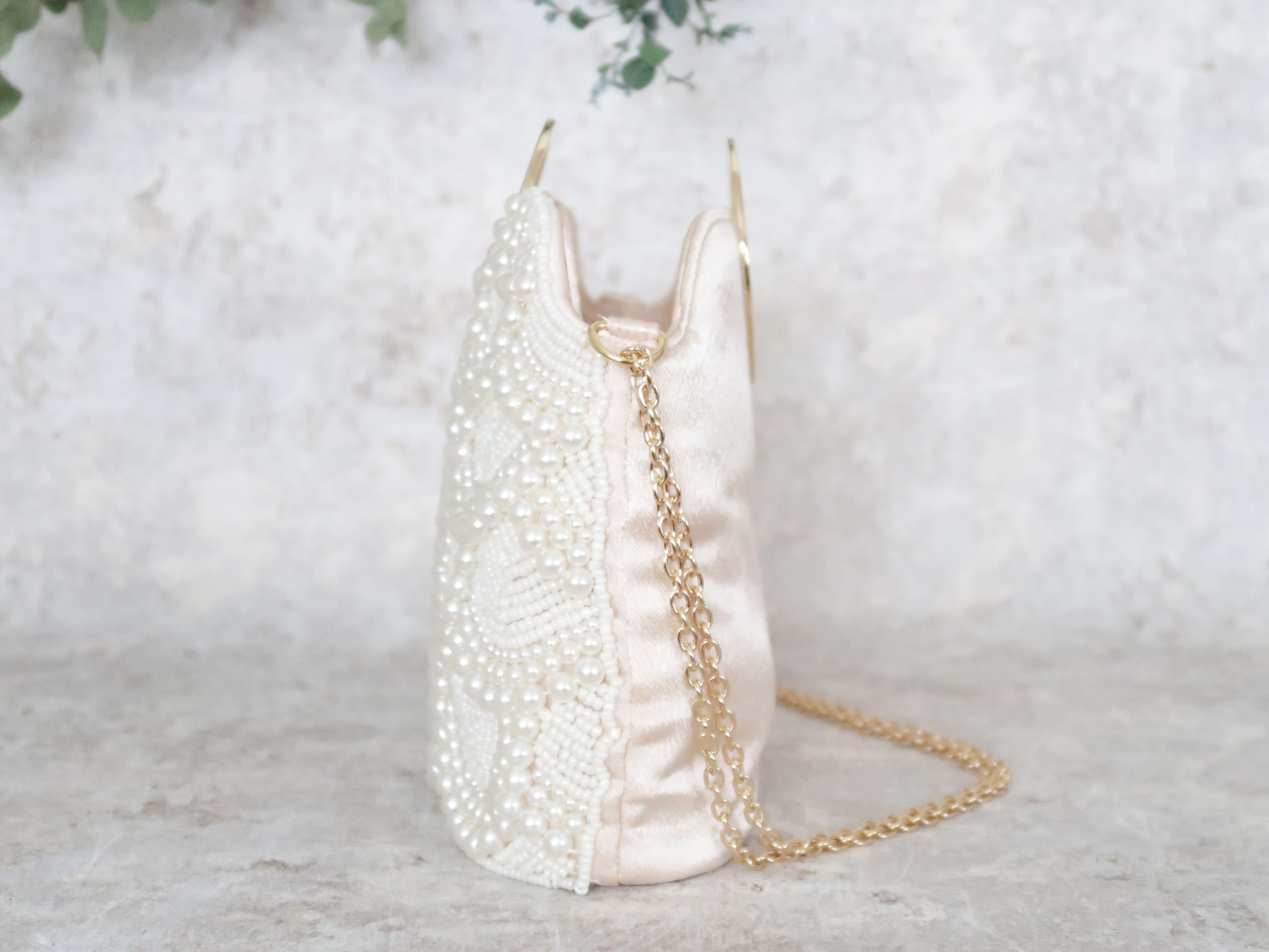 パールで象られたスカラップの模様がとてもおしゃれなバッグです。