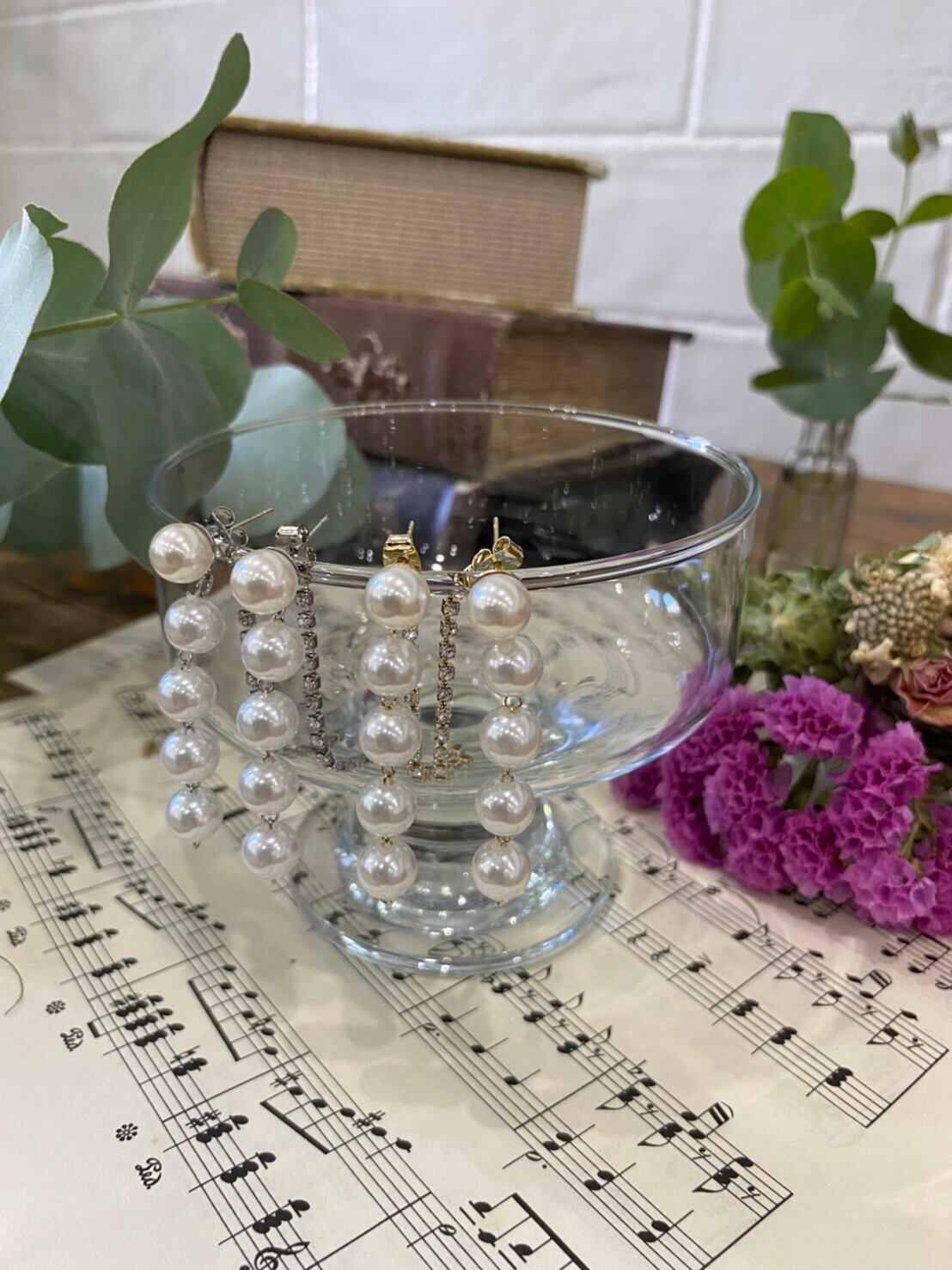 耳元で華やかに揺れるパールがお顔周りを美しく彩ってくれるロングピアス。