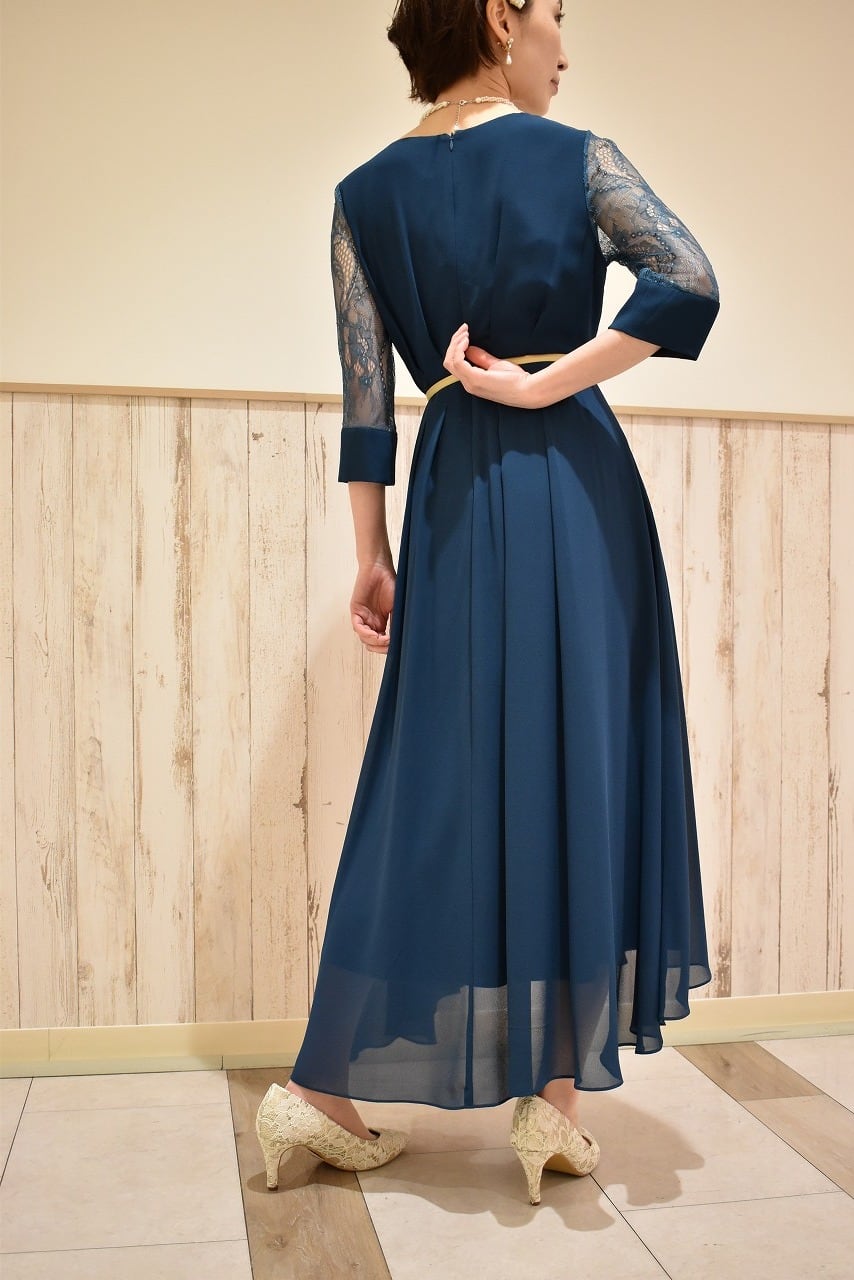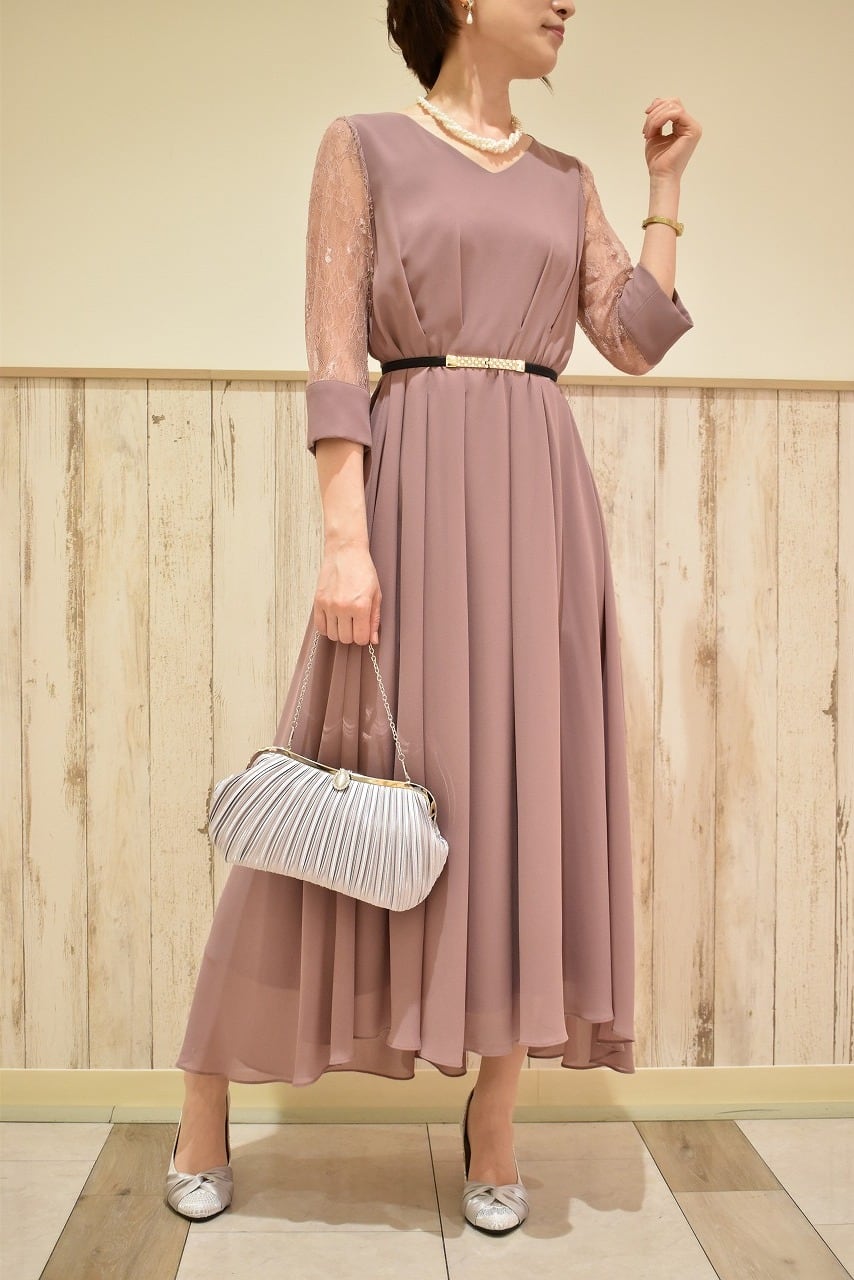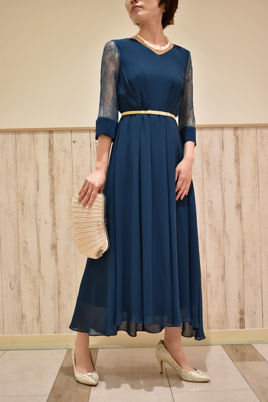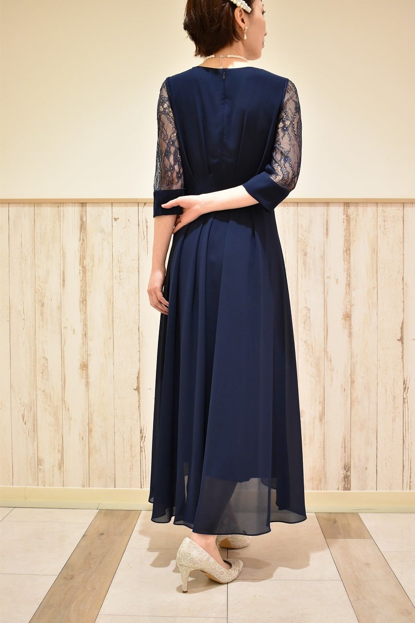 透け感のあるお袖なので女性の気になる二の腕を優しくカバーしてくれ安心して1枚で着用できます。Vネックの首元はデコルテラインをスッキリさせてくれるので華やかなネックレスが相性抜群。全体のラインを美しく見せてくれるドレスは後ろファスナーで着脱もしやすいのもポイントです。