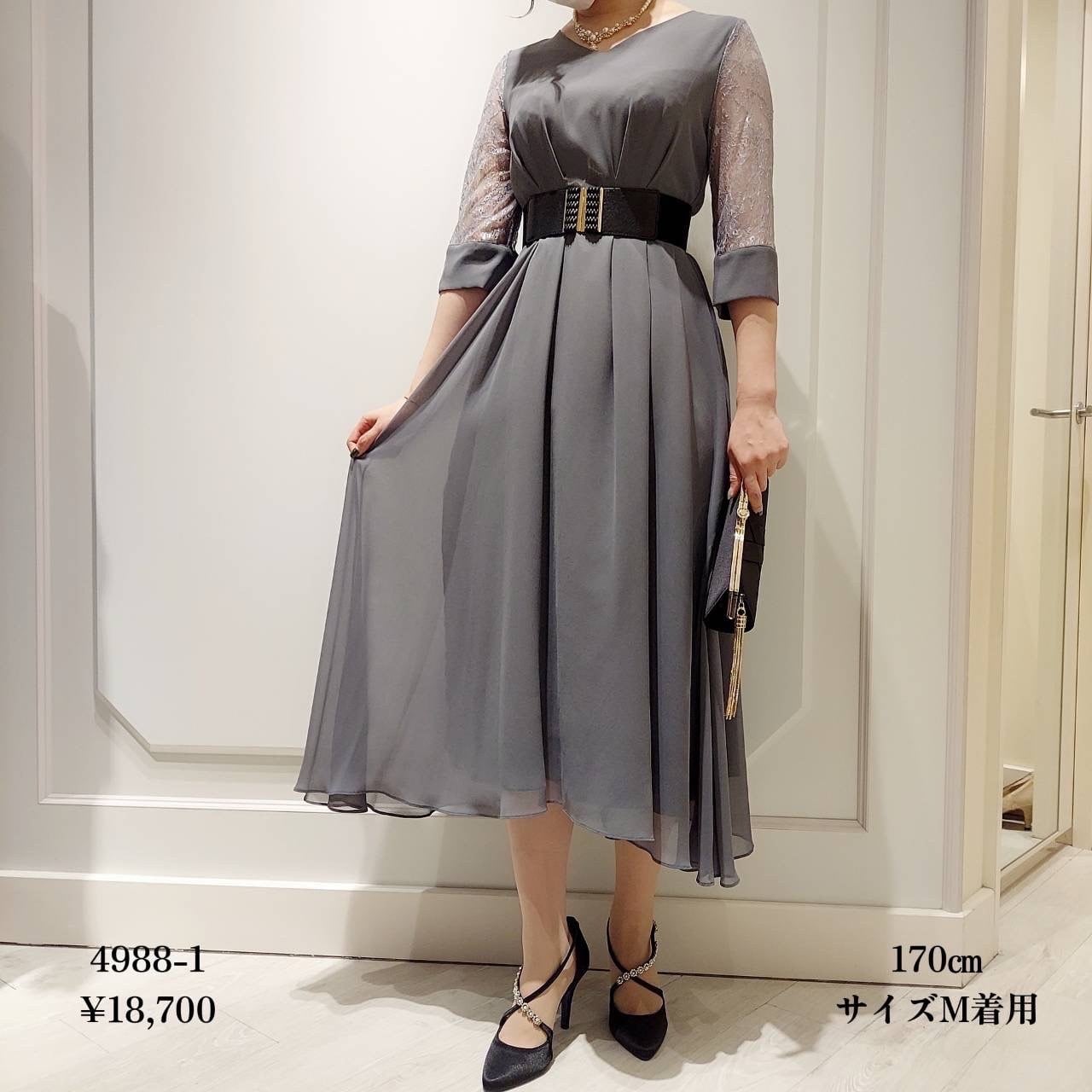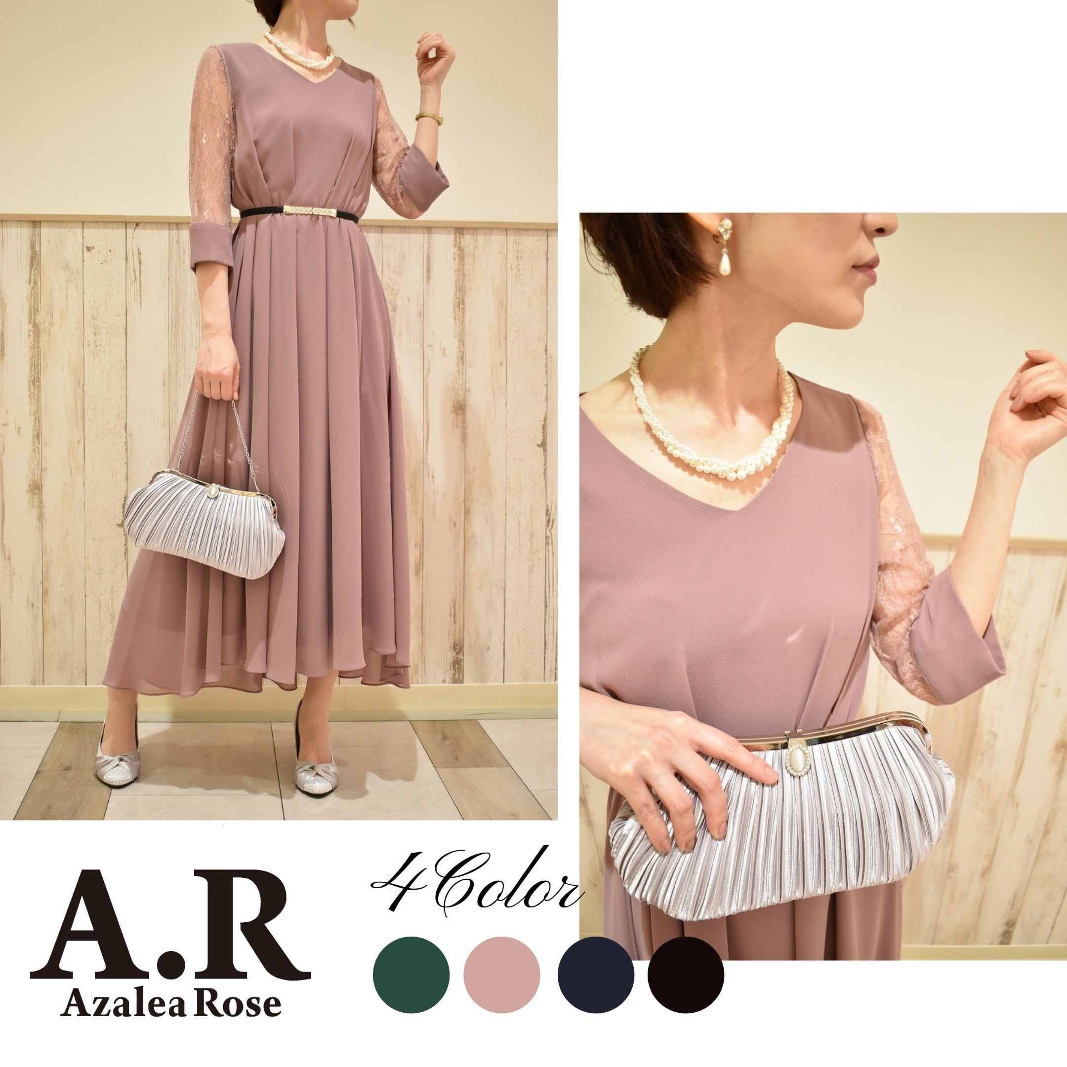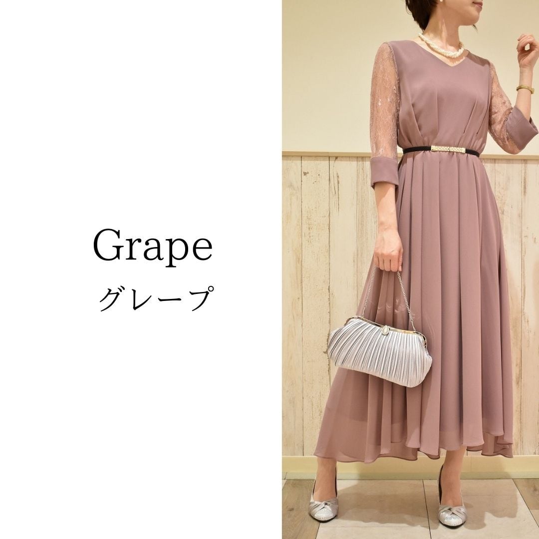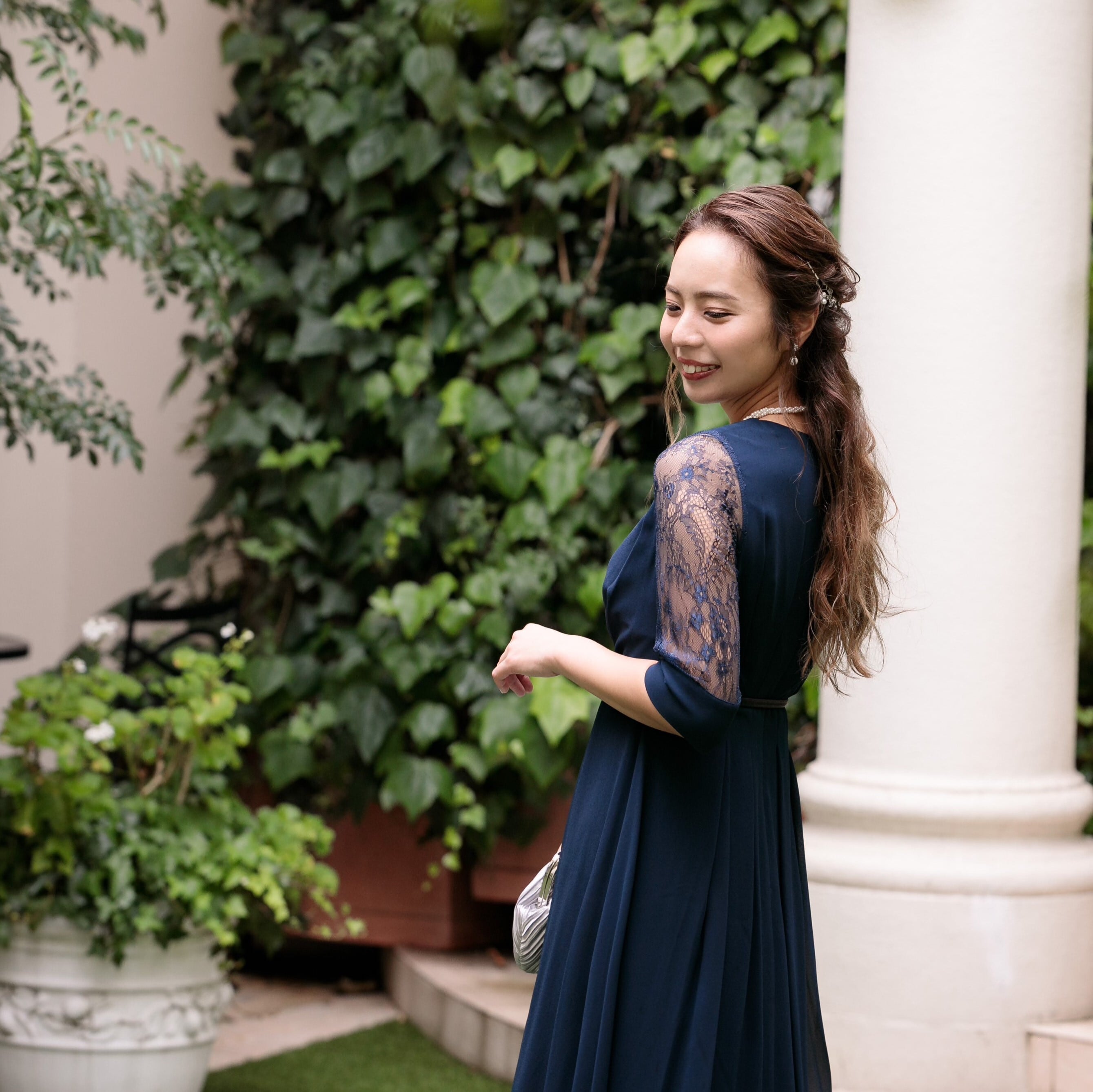 透け感のあるお袖なので女性の気になる二の腕を優しくカバーしてくれ安心して1枚で着用できます。Vネックの首元はデコルテラインをスッキリさせてくれるので華やかなネックレスが相性抜群。全体のラインを美しく見せてくれるドレスは後ろファスナーで着脱もしやすいのもポイントです。