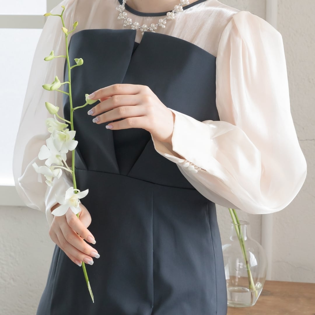 パフスリーブのブラウスとビスチェドレスをレイヤードしたようなデザインがポイント。