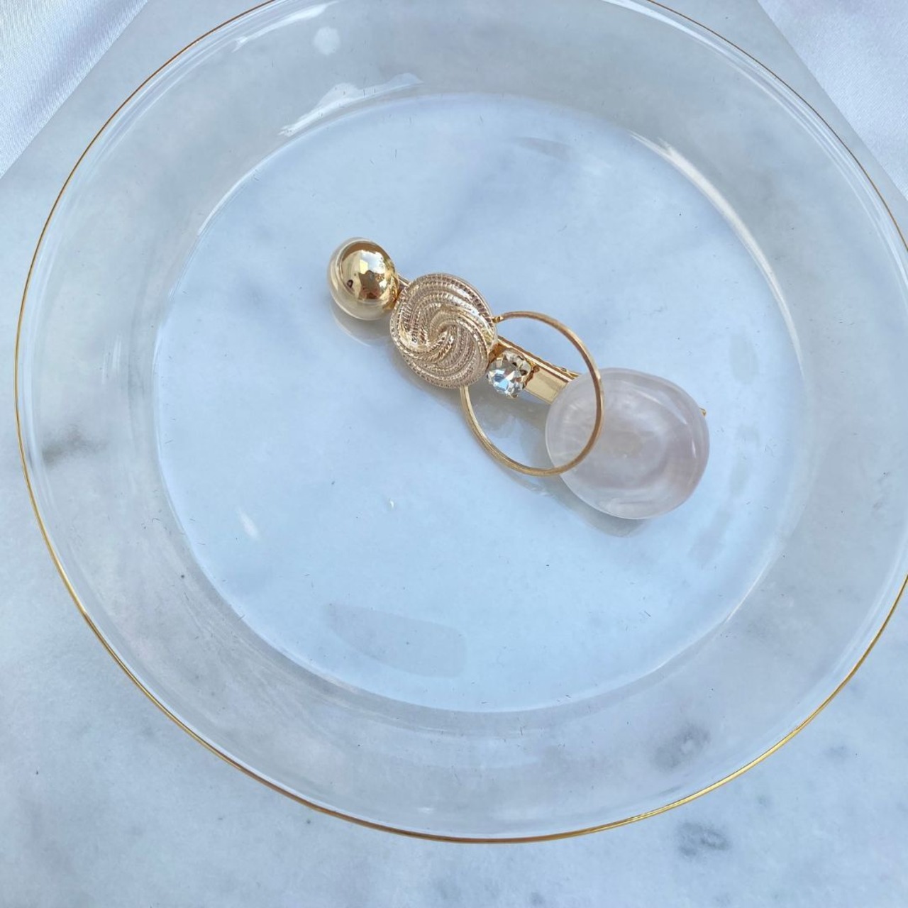 透明感が美しいゴールドリングモチーフヘアクリップです。シンプルながらもエレガントな印象で使いやすく、様々なヘアスタイルにマッチします。リングの内側にはクリップがついており、髪を優しくしっかりと留めてくれます。重たい印象を持ちがちなゴールドですが、透明感のあるデザインなので重たくなく、爽やかで清楚な印象にしてくれます。