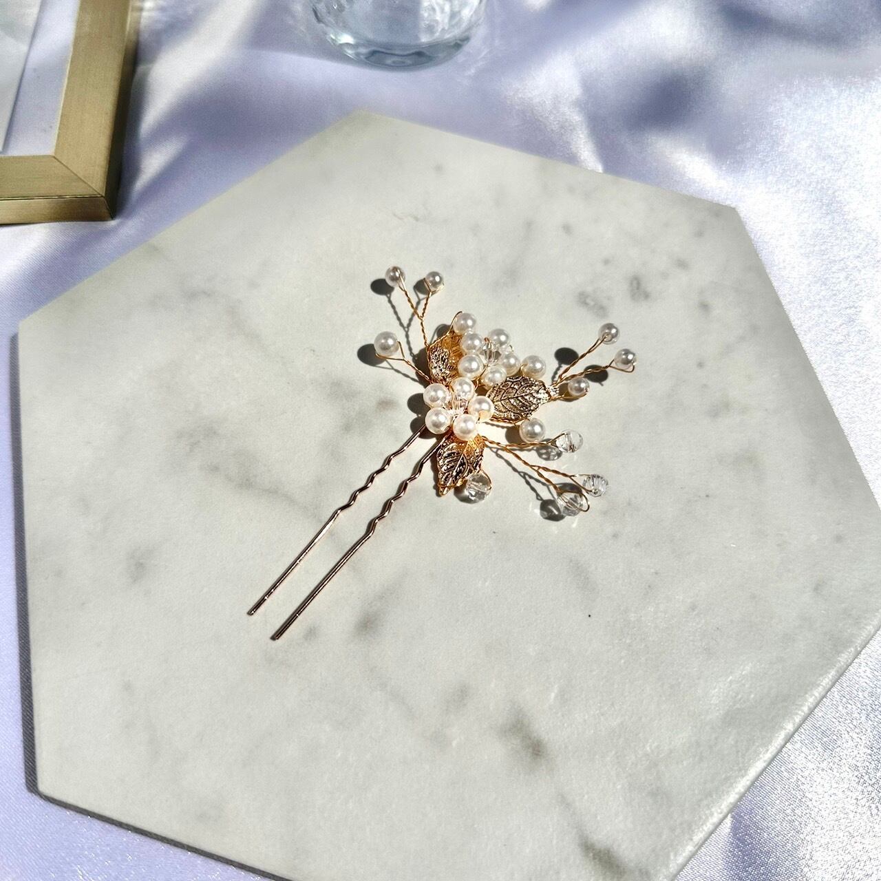 華やかなヘアスタイルを演出する、パールフラワーリーフモチーフヘアピンのご紹介です。美しいパールと煌めくリーフモチーフが可憐で、女性らしさを引き立たせます。ブライダルシーンはもちろん、パーティーやデートなどの華やかな場面でも大活躍。髪をアップにして、ヘアピンを付けるだけで、簡単にドレスアップができます。