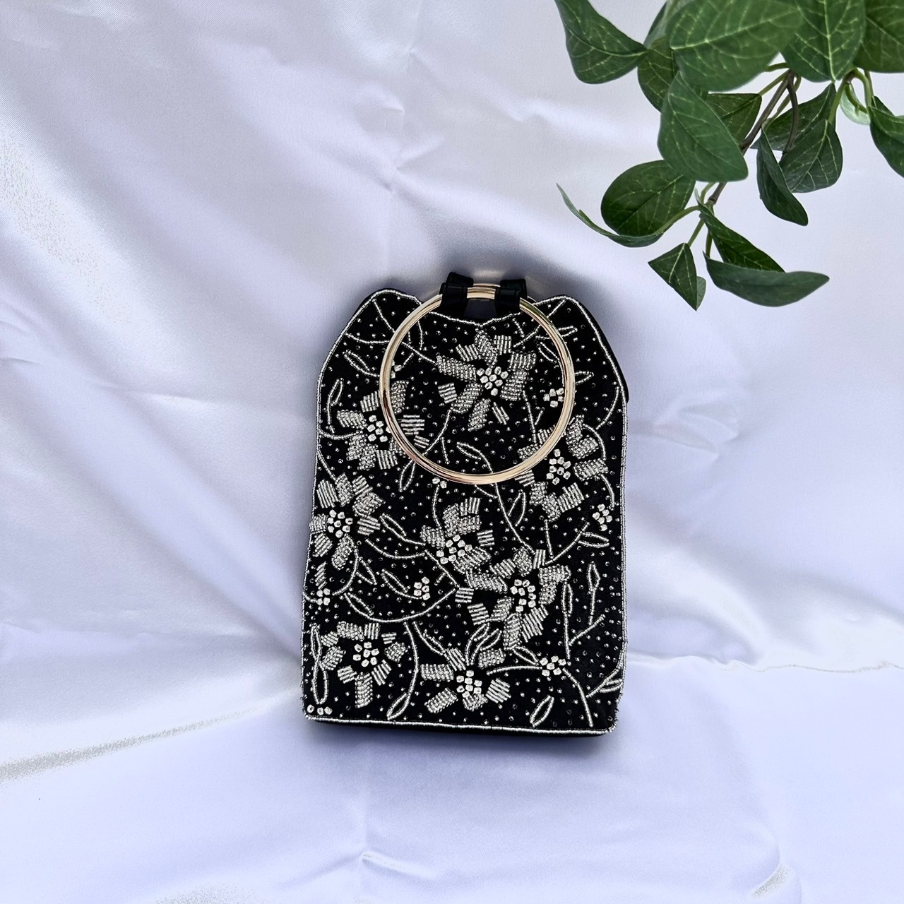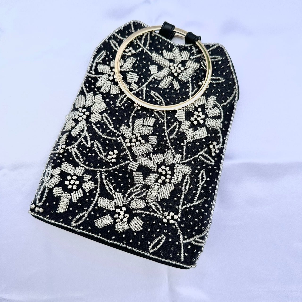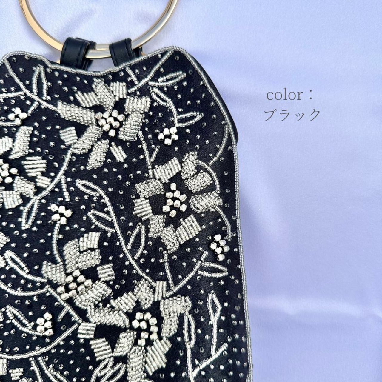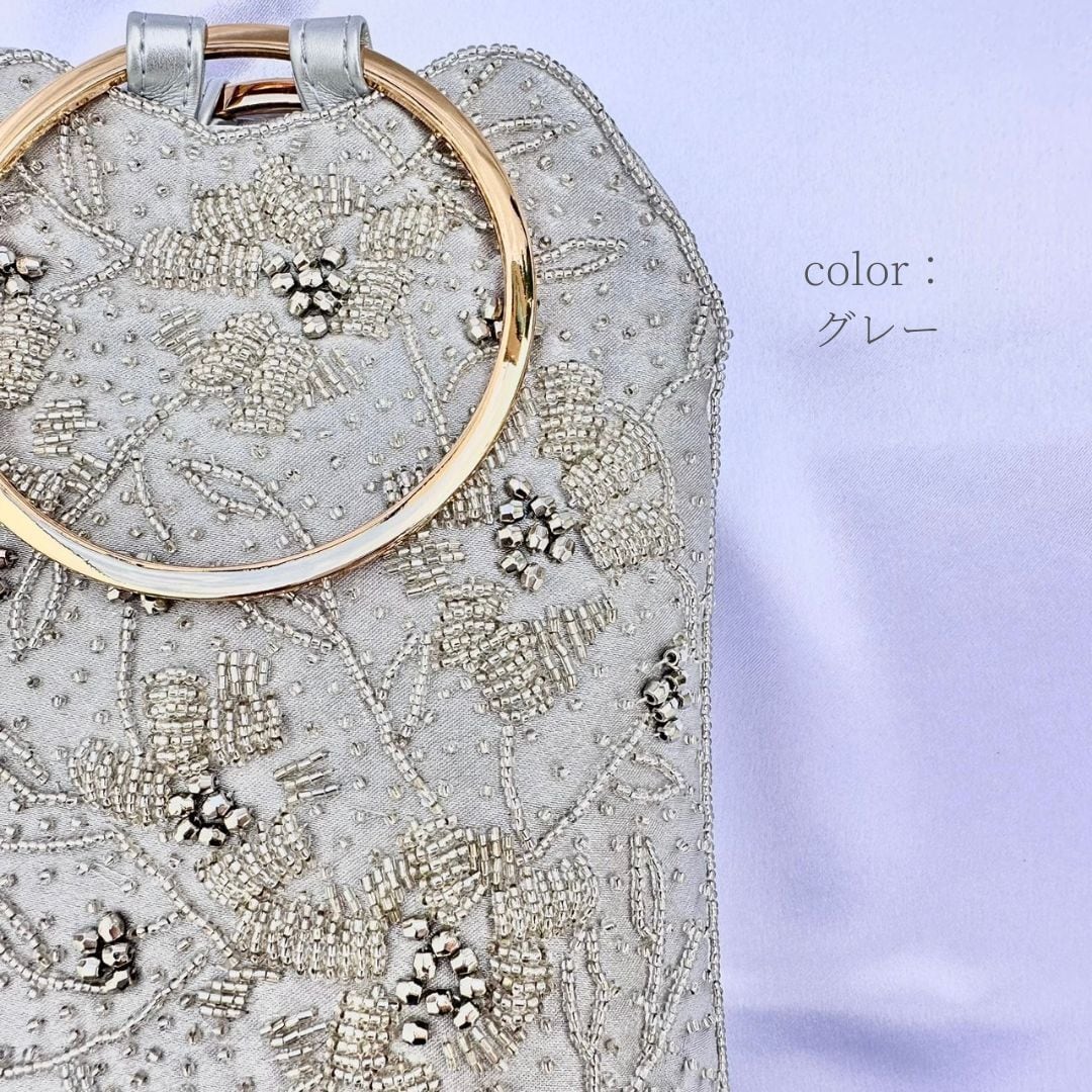 大きなリングハンドルがワンポイントと手縫いのビーズでひとつずつ丁寧に仕上げた特別感のある一点です。