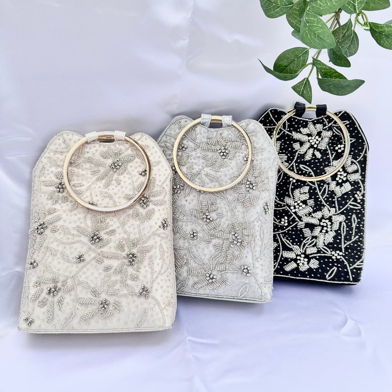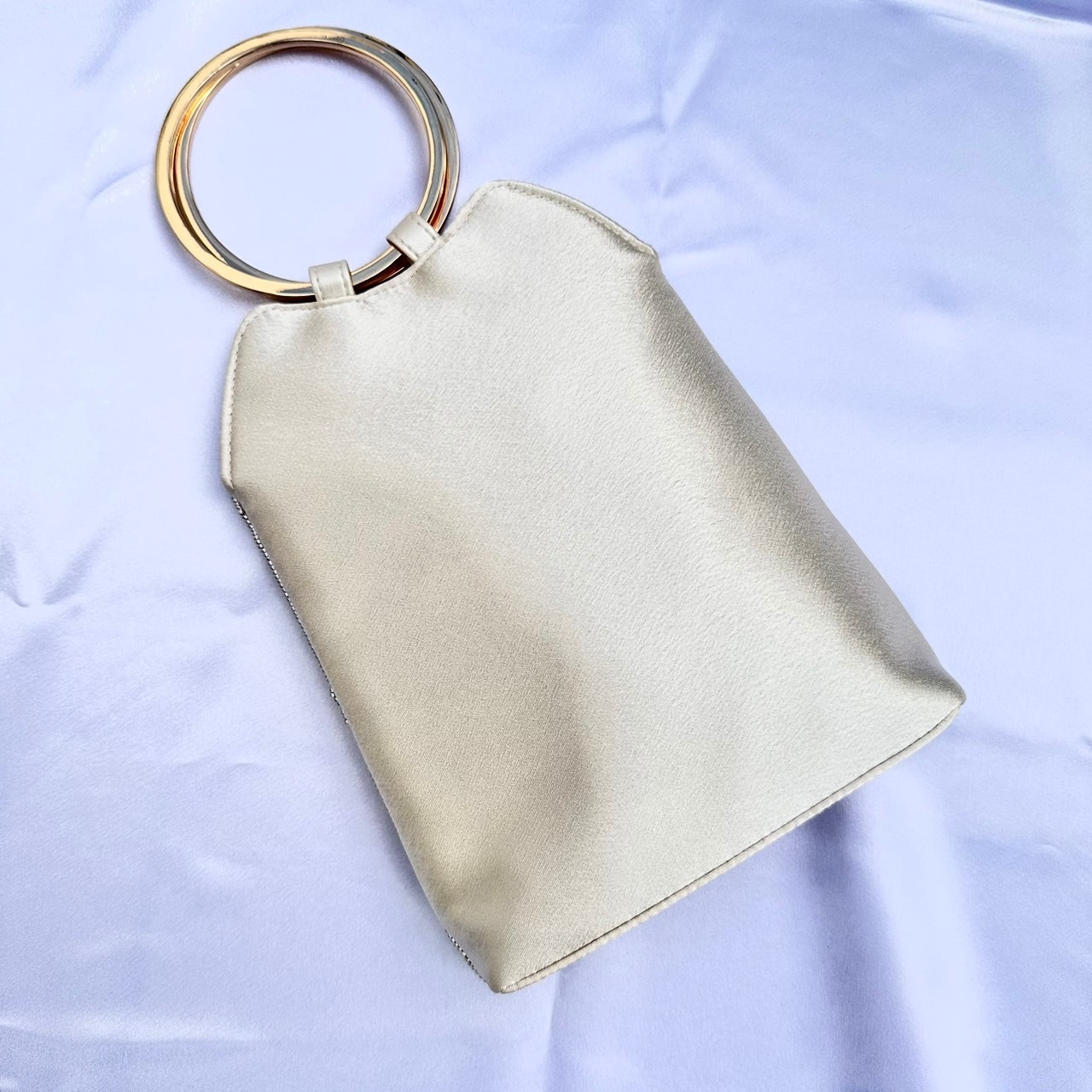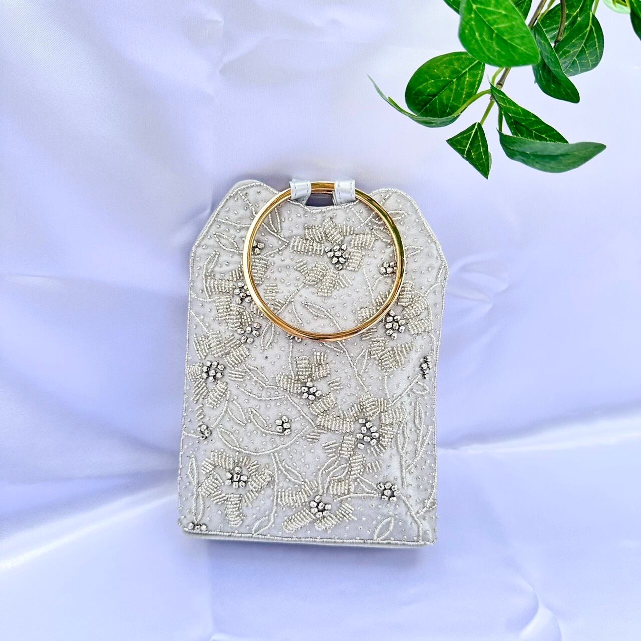 大きなリングハンドルがワンポイントと手縫いのビーズでひとつずつ丁寧に仕上げた特別感のある一点です。